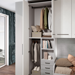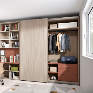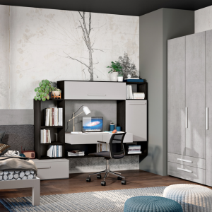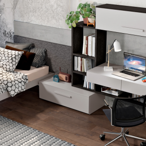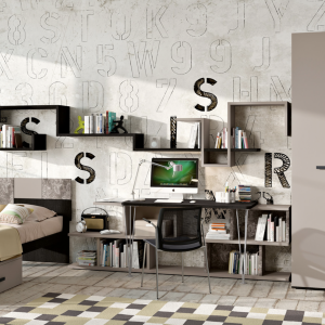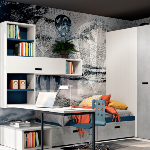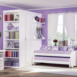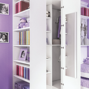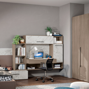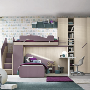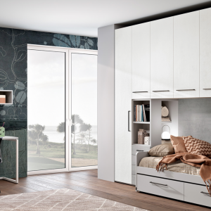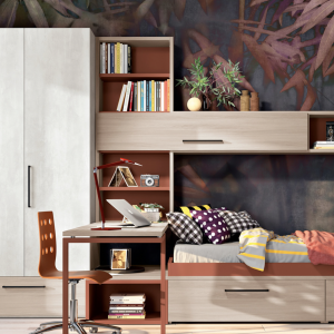 - Ragazze che crescono insieme! Composizione Ponte a due letti, Testiere “Onda” e “Nuvola” e Armadi lineari, componibili scegliendo tra diversi colori e organizzando al loro interno tubi appendiabiti sali e scendi e mensole. Da un lato, anche per loro, la zona notte e dall’altro, la zona studio con Scrivania e Colonna libreria, componibile nel numero di elementi, di mensole e…