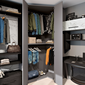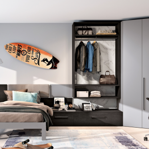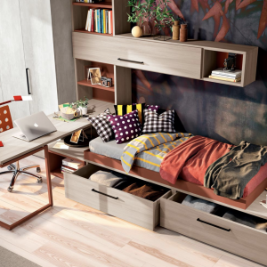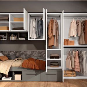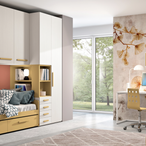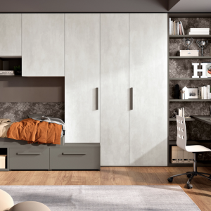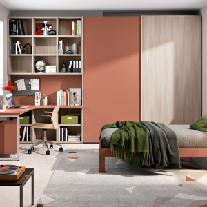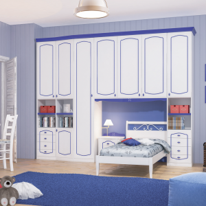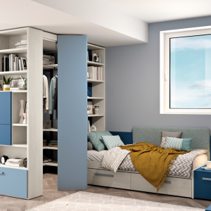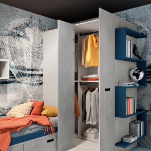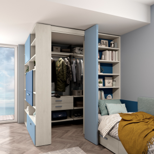 - Ad ogni ragazzo la propria passione! Composizione con Letto Contenitore con Testiera “Yacht” e armadi lineari, componibili scegliendo tra diversi colori e organizzando al loro interno tubi appendiabiti, cassettiere e mensole. Da un lato la zona notte, con cubotti a muro (a vano o con anta) per contenere quanto di più bello vogliamo si veda di noi, dall’altro la zona…